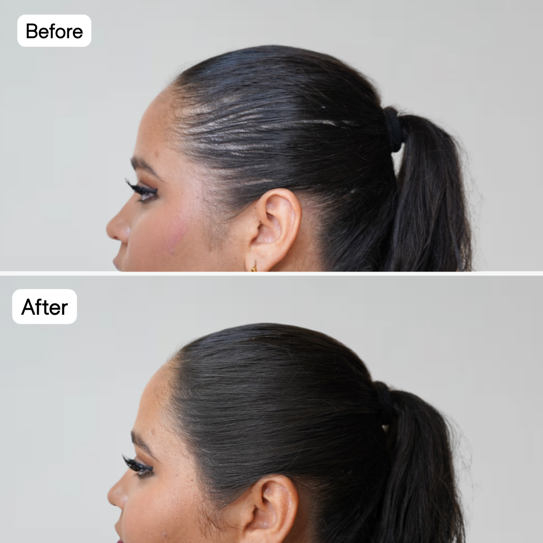 Door hormonen of ouderdom kan je haarlijn dun worden en zich terugtrekken, Met Density Fiber verbeter jij je haarlijn
